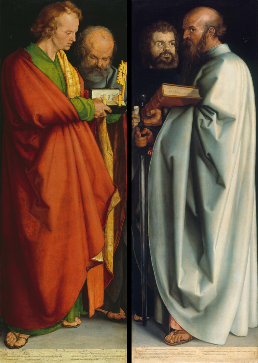 Dürer’s oil paintings also possess a powerful, moving quality. “The Four Apostles,” a masterpiece from his later years, depicts the four apostles: St. John, St. Peter, St. Mark, and St. Paul. The figures in the painting are solemn and resolute, reflecting Dürer’s profound reflections on the Reformation. Through delicate brushstrokes and rich colors, he masterfully portrays the inner world of his subjects. This work is not only a masterpiece of religious art but also a culmination of Dürer’s artistic career.