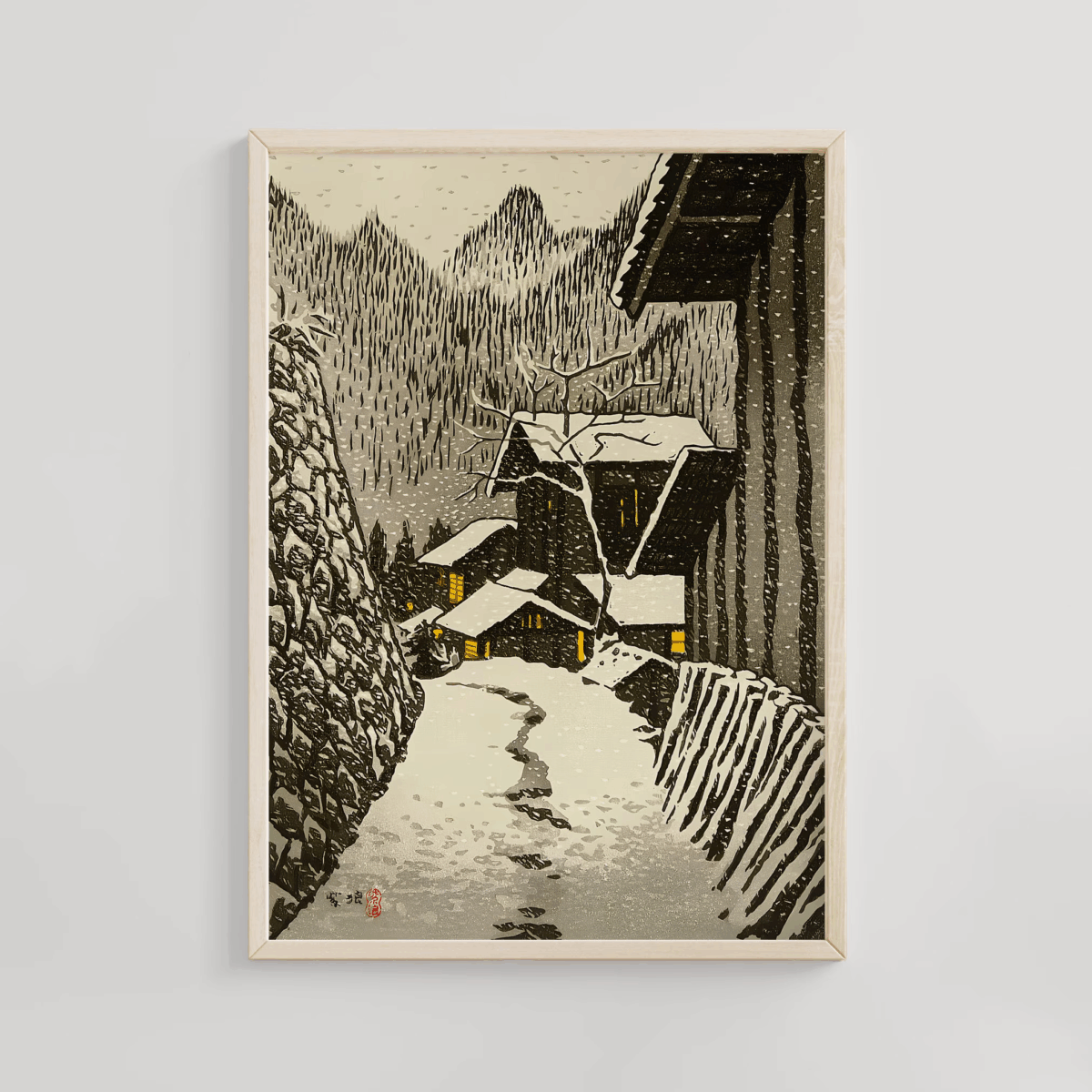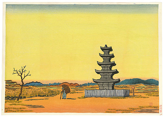 In his works, such as woodblock prints depicting temples, ancient pagodas, and tranquil landscapes, architecture is often simplified into solid and restrained forms, with steady lines and concise compositions. However, what truly dominates the picture is not the architecture itself, but the “emptiness” around it—vast blank spaces, still skies, and silent spaces. These undepicted parts give the picture a power that transcends form.
