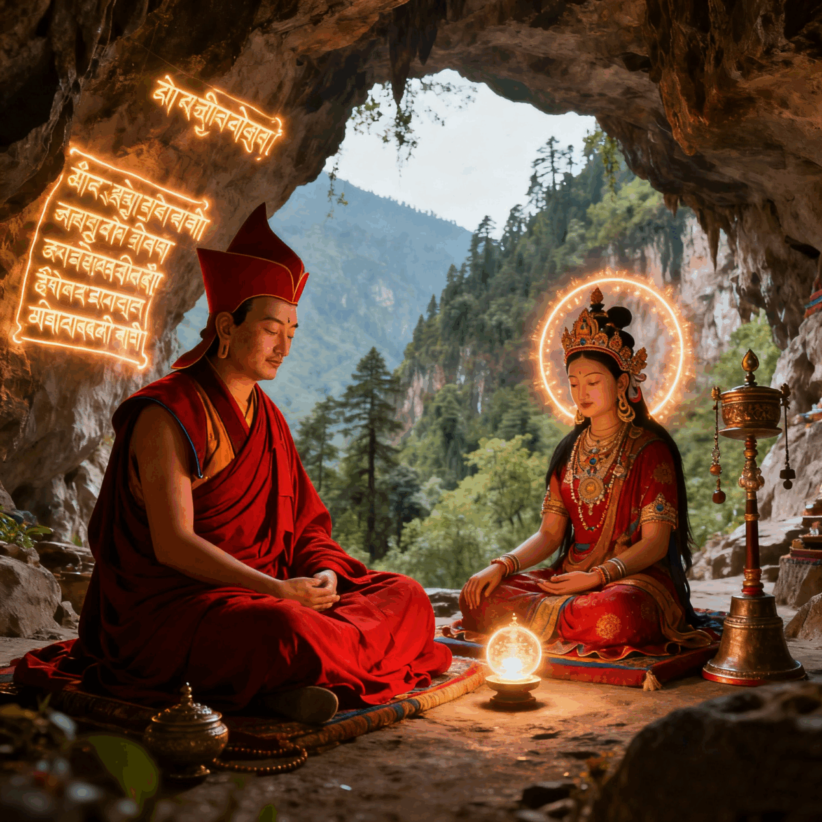 Among the many legends, one famous story relates that he and his female disciple, Mandarava, practiced in Maratika (a cave in Nepal), achieving longevity and enlightenment.