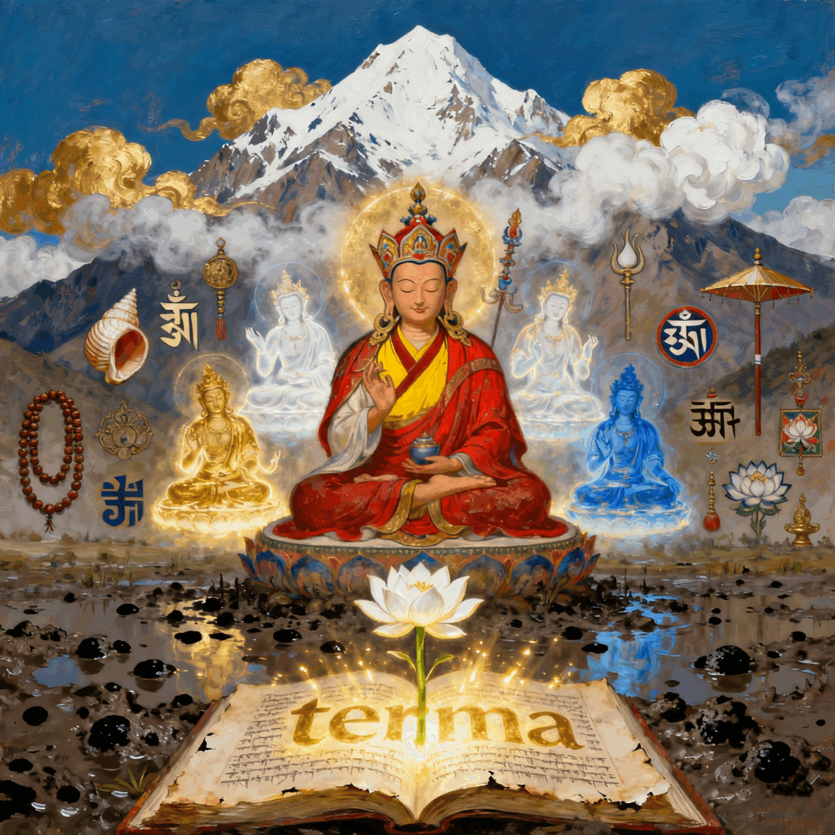 His name, “Padmasambhava,” signifies wisdom blossoming like a pure lotus above the muddy earth, signifying enlightenment transcending the ordinary.