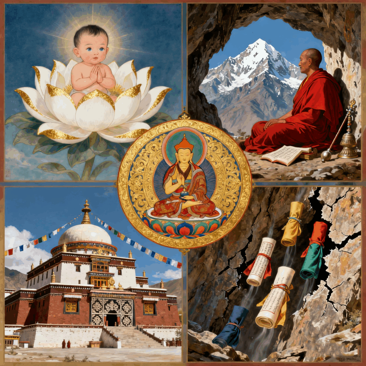 In Tibetan Buddhist tradition, Guru Padmasambhava (Sanskrit Padmāsambhava, also known as Guru Rinpoche in Tibetan, meaning “Precious Master”) is revered as the “Second Buddha” and one of the key founders of Vajrayana Buddhism in Tibet and the Himalayas. The following outlines his life and significance through four perspectives: his birth legend, his practice and activities, his propagation of the Dharma in Tibet, and his spirit and legacy.