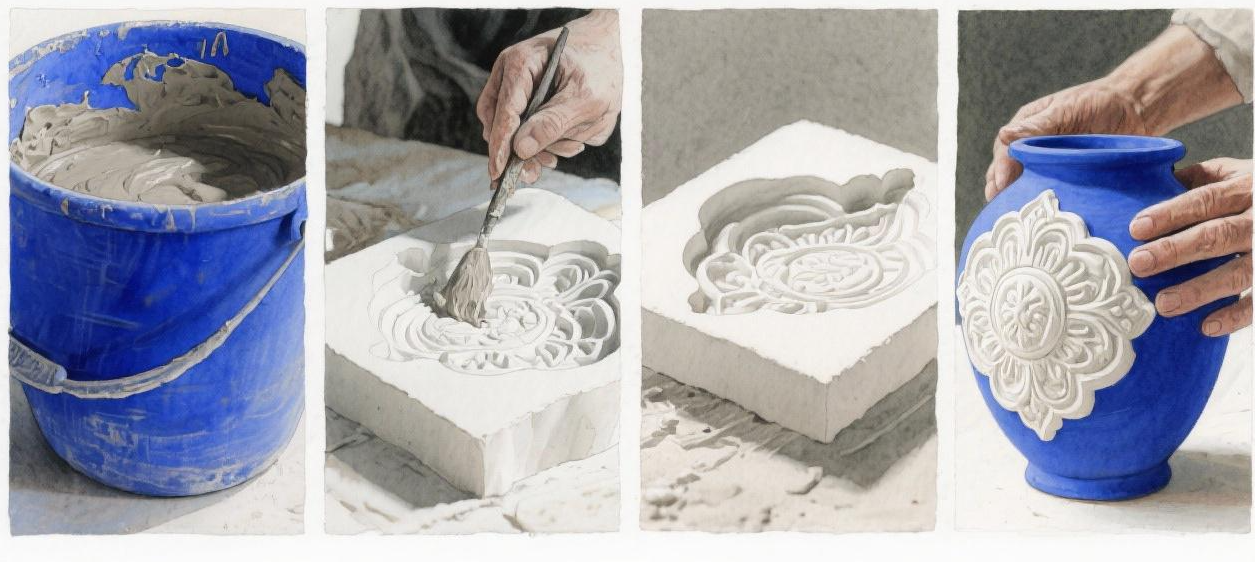 3. Careful Attachment: While the main body is not completely dry, craftsmen use a special clay as an “adhesive” to precisely attach each delicate white relief piece to the blue main body by hand. This process requires extremely high patience and skill; even the slightest deviation will ruin the entire piece.