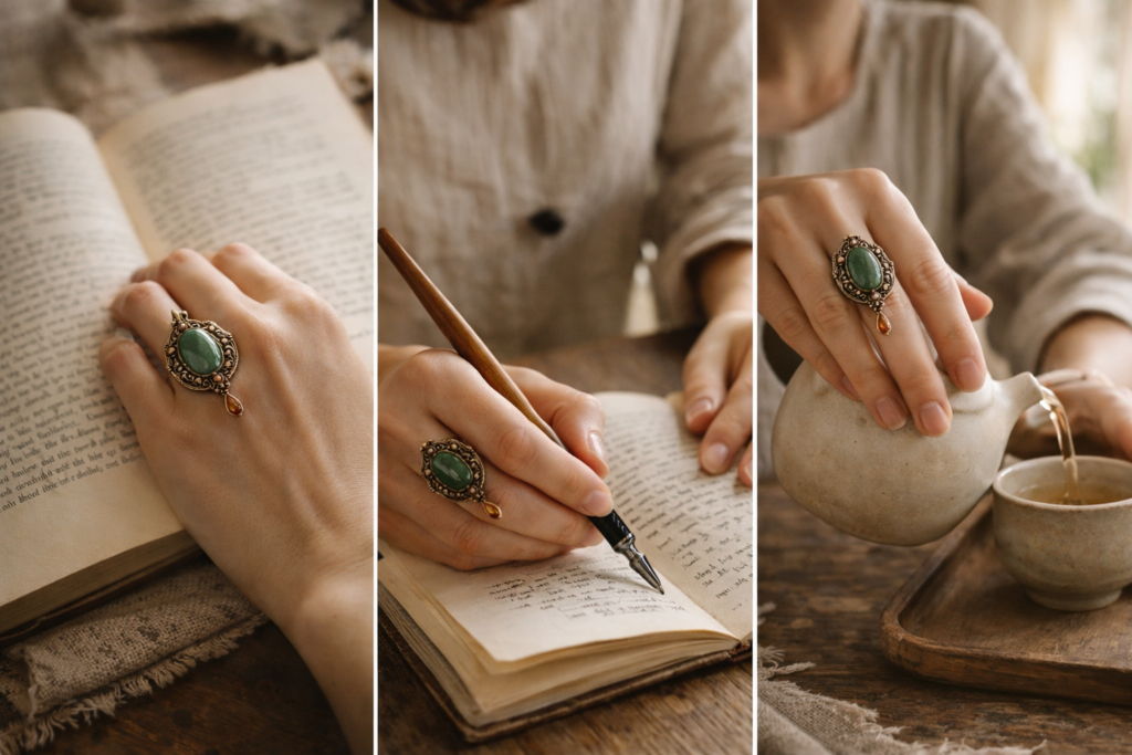 When an antique-style piece of real jewelry enters daily life, it participates in ordinary moments: turning pages, writing, thinking, conversing. The wearer may not always be consciously aware of its presence, yet it is precisely in this understated state that culture is transmitted most naturally.