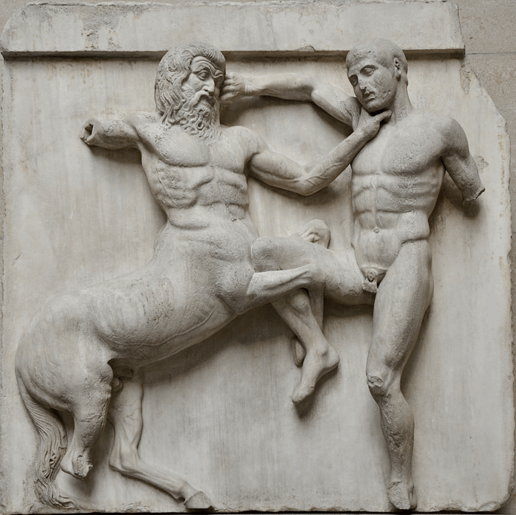 The battle between Centaurs and Lapiths symbolizes the struggle between wildness and reason; the Amazons and Greeks embody chaos and order; the Gigantomachy — gods against giants — enacts the eternal restoration of cosmic balance.