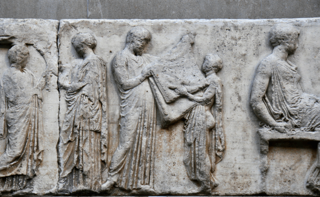 On the marble, the figures move in quiet dignity: a young rider adjusting his bridle, a maiden offering a sacred robe, gods seated in calm contemplation watching the mortals’ ritual.