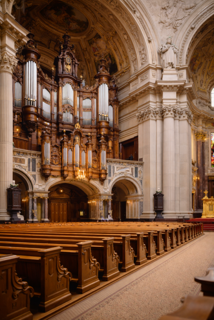One of the most impressive features inside the cathedral is its enormous pipe organ. With more than 7,000 pipes, it is among the largest church organs in Europe. When the music begins, the sound reverberates beneath the vast dome, filling the entire space as if the building itself were breathing.