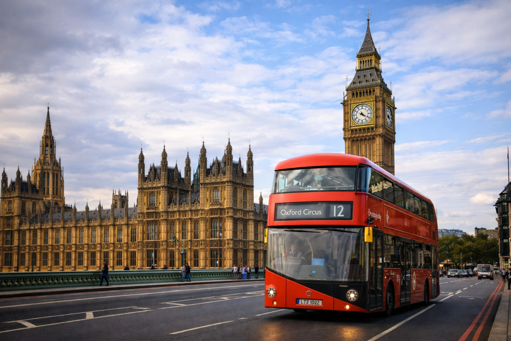 the River Thames flowing gently, red double-decker buses passing through the streets, and in the distance the quiet silhouette of the clock tower while its chimes echo above the city.