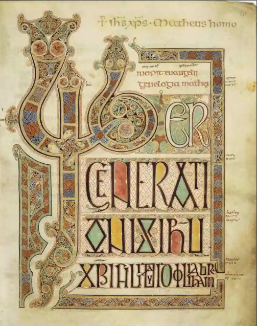 When discussing illuminated manuscripts, one cannot overlook the “Book of Kells,” often hailed as Ireland’s national treasure. Created around the 9th century, this illuminated manuscript represents the pinnacle of Western calligraphy and painting, epitomizing the Hiberno-Saxon style that flourished in Ireland and England from the 7th to the 9th centuries. Its pages are adorned with extraordinarily intricate and ornate decorations, filled with Celtic spirals, interlace patterns, and various fantastical animal motifs, with colors that remain strikingly vivid to this day.
