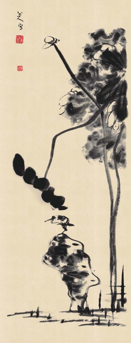 Ink Mastery: Parched brush and scorched ink for lotus stems; tear-like dense moss dots; sparse composition defying classical aesthetics.