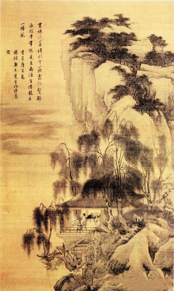 Ink Experimentation: “Axe-cut” (fǔpǐ) strokes define rocks; pale ochre washes suggest dusk; willow branches rendered with calligraphic “flying-white” (fēibái) technique.
